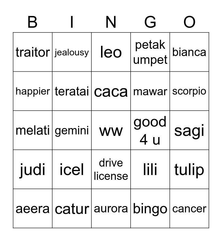 This bingo card has 25 words: icel, aurora, caca, aeera, bianca, traitor, happier, jealousy, good 4 u, drive license, mawar, melati, lili, tulip, teratai, cancer, sagi, leo, scorpio, gemini, ww, catur, judi, petak umpet and bingo.