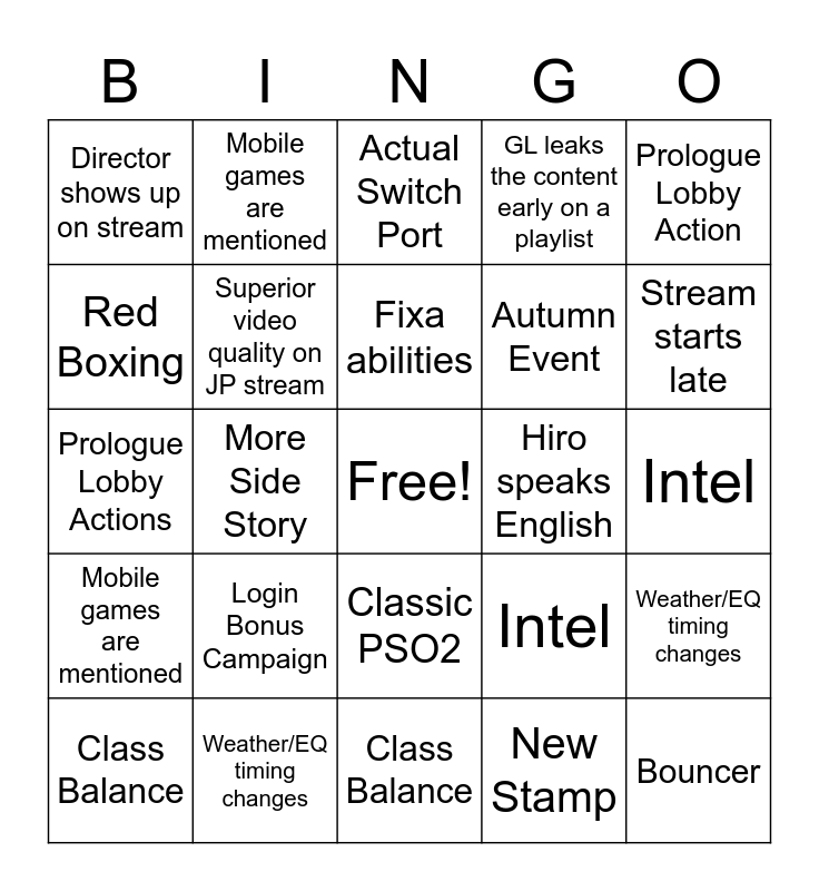⚠ This card has duplicate items: Autumn Event (2), Bouncer (2), Stream starts late (2), Class Balance (2), Login Bonus Campaign (2), Classic PSO2 (2), Mobile games are mentioned (2), Live comments are still disabled (2), Red Boxing (2), Shop Pass (2), Superior video quality on JP stream (2), GL leaks the content early on a playlist (2), Weather/EQ timing changes (2), Intel (2), Mission Pass (2), Trigger Quests (2), Fixa abilities (2), Hiro speaks English (2), Actual Switch Port (2)