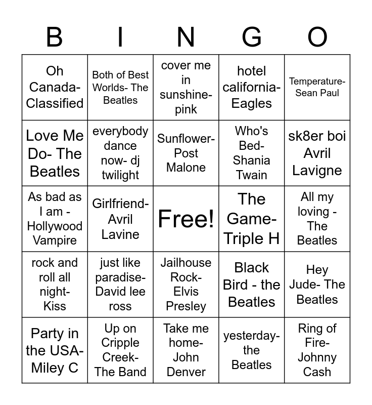 This bingo card has a free space and 24 words: just like paradise- David lee ross, Up on Cripple Creek- The Band, Sunflower- Post Malone, Party in the USA- Miley C, Temperature- Sean Paul, Oh Canada- Classified, Love Me Do- The Beatles, Both of Best Worlds- The Beatles, The Game- Triple H, Jailhouse Rock- Elvis Presley, Who's Bed- Shania Twain, As bad as I am - Hollywood Vampire, Black Bird - the Beatles, Hey Jude- The Beatles, everybody dance now- dj twilight, yesterday- the Beatles, All my loving - The Beatles, cover me in sunshine-pink, sk8er boi Avril Lavigne, Girlfriend- Avril Lavine, Ring of Fire- Johnny Cash, rock and roll all night- Kiss, hotel california-Eagles and Take me home- John Denver.