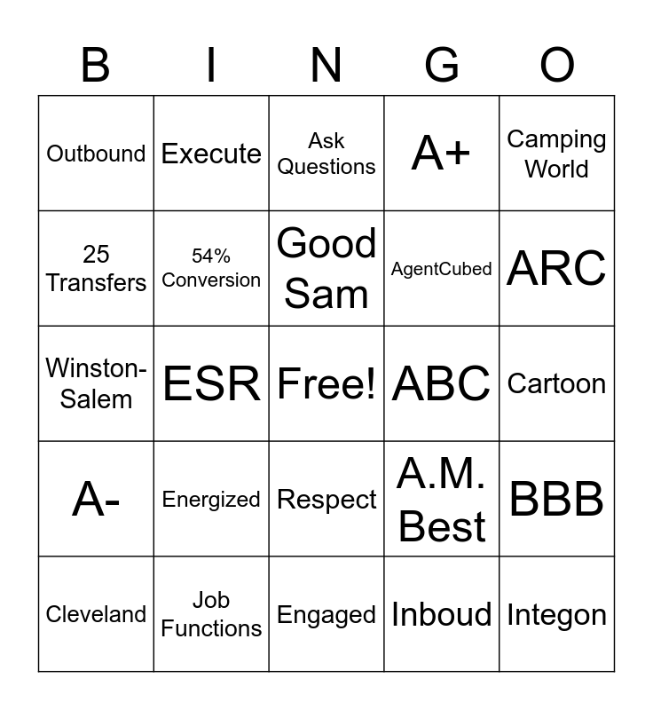 This bingo card has a free space and 50 words: National General Insurance, Integon, KPI, Engaged, Energized, Empowered, Execute, 4E's, 25 Transfers, 425 Dials, 54% Conversion, A+, BBB, A.M. Best, Personal Lines, Direct Auto, Good Sam, ABC, Personal Express, Camping World, ESR, Inboud, Outbound, AgentCubed, Sellable Leads, Outlook, ARC, Interaction Desktop, Ask Questions, Respect, Lock Computer, Who is it?, Noe, Beltran, Job Functions, Expectations, Passphrase, Color, Car, Cartoon, Food, Transfer Locations, Portland, Dallas, Cleveland, Winston-Salem, Tijuana, New York City, A- and RV.