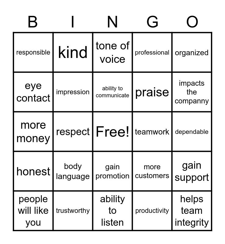 This bingo card has a free space and 24 words: body language, trustworthy, ability to communicate, people will like you, organized, responsible, eye contact, kind, teamwork, gain promotion, praise, more money, more customers, gain support, impression, productivity, dependable, tone of voice, impacts the companny, respect, helps team integrity, honest, professional and ability to listen.