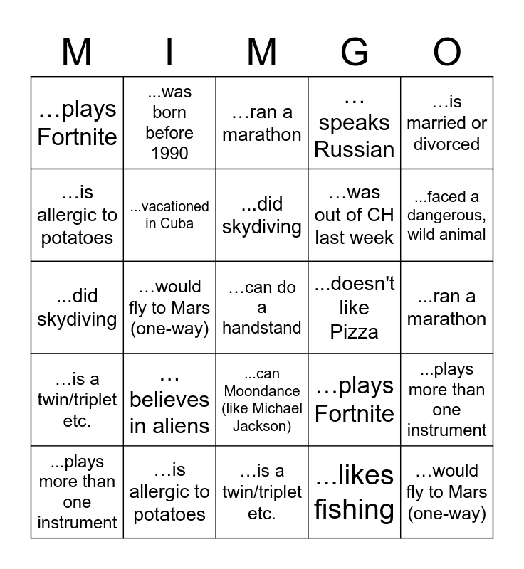 ⚠ This card has duplicate items: ...is left-handed (2), ...has 3 or more siblings (2), ...faced a dangerous, wild animal (2), ...plays more than one instrument (2), ...knows Martial Arts (2), ...likes fishing (2), ...was born before 1990 (2), ...vacationed in Cuba (2), ...did skydiving (2), ...doesn't like Pizza (2), ...can Moondance (like Michael Jackson) (2), …is in the last year of their PhD (2), …is married or divorced (2), …can do a handstand (2), …is allergic to potatoes (2), …would fly to Mars (one-way) (2), …plays Fortnite (2), …can lift 1 eyebrow (2), …was out of CH last week (2), …believes in aliens (2), …is a twin/triplet etc. (2), …speaks Russian (2), …has never seen StarWars (2), …’s name contains an X, Y or Z (2), …has green eyes (2), …has more than 3 piercings (2), …visited Disneyland (2), …contracted Covid19 (2), …shares your birthday (2), …speaks 4 or more languages (2), …can properly imitate an animal (2)
