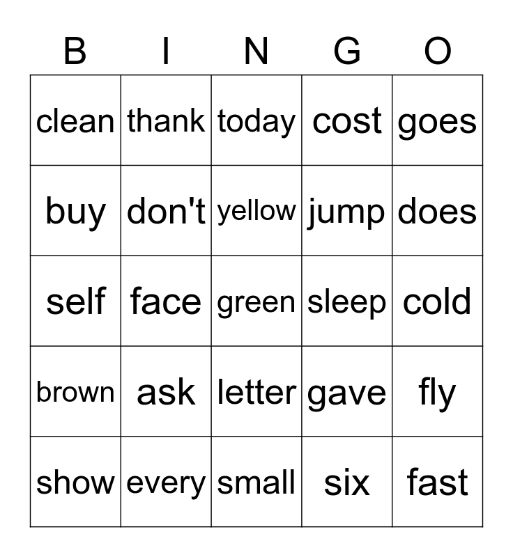 This bingo card has 25 words: ask, small, yellow, show, goes, clean, buy, thank, sleep, letter, jump, self, gave, fly, don't, fast, cold, today, does, face, green, every, brown, cost and six.