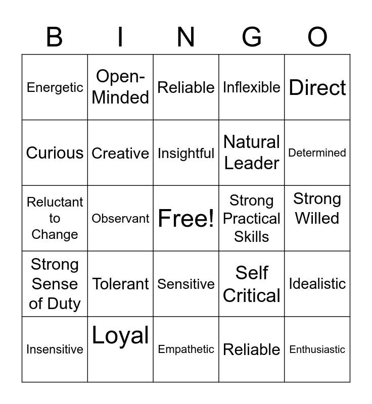 This bingo card has a free space and 24 words: Tolerant, Loyal, Insightful, Insensitive, Direct, Energetic, Curious, Open-Minded, Strong Practical Skills, Sensitive, Natural Leader, Reluctant to Change, Self Critical, Idealistic, Creative, Reliable, Strong Willed, Reliable, Determined, Observant, Enthusiastic, Strong Sense of Duty, Inflexible and Empathetic.