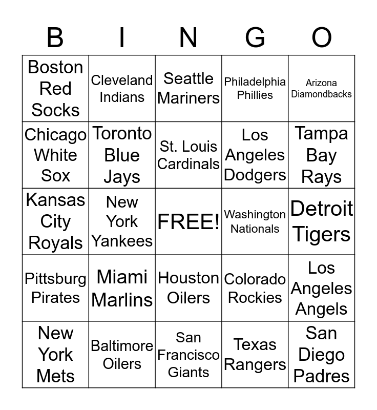 This bingo card has a free space and 26 words: Houston Oilers, Texas Rangers, St. Louis Cardinals, Baltimore Oilers, Arizona Diamondbacks, Boston Red Socks, Chicago White Sox, Cleveland Indians, Detroit Tigers, Colorado Rockies, Los Angeles Dodgers, Kansas City Royals, Los Angeles Angels, New York Mets, New York Yankees, Oakland Athletics, Philadelphia Phillies, Pittsburg Pirates, Seattle Mariners, San Diego Padres, Tampa Bay Rays, San Francisco Giants, Washington Nationals, Miami Marlins, Toronto Blue Jays and Atlanta Braves.