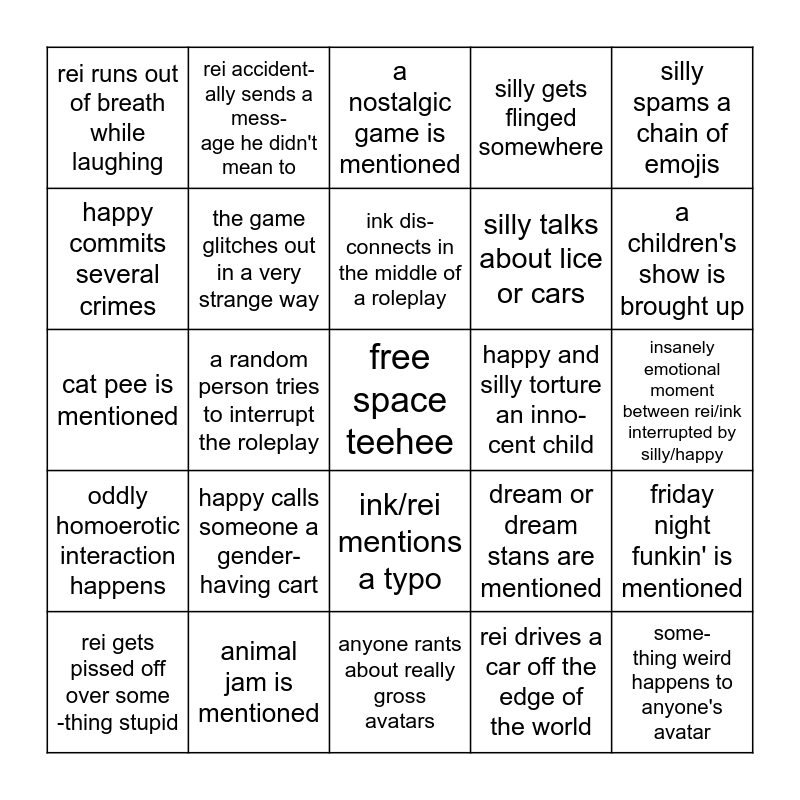 This bingo card has a free space and 24 words: happy calls someone a gender-having cart, animal jam is mentioned, ink dis- connects in the middle of a roleplay, rei gets pissed off over some -thing stupid, silly spams a chain of emojis, rei runs out of breath while laughing, happy commits several crimes, rei accident-ally sends a mess- age he didn't mean to, happy and silly torture an inno-cent child, ink/rei mentions a typo, silly talks about lice or cars, cat pee is mentioned, dream or dream stans are mentioned, friday night funkin' is mentioned, the game glitches out in a very strange way, rei drives a car off the edge of the world, insanely emotional moment between rei/ink interrupted by silly/happy, a nostalgic game is mentioned, a children's show is brought up, a random person tries to interrupt the roleplay, some- thing weird happens to anyone's avatar, oddly homoerotic interaction happens, silly gets flinged somewhere and anyone rants about really gross avatars.