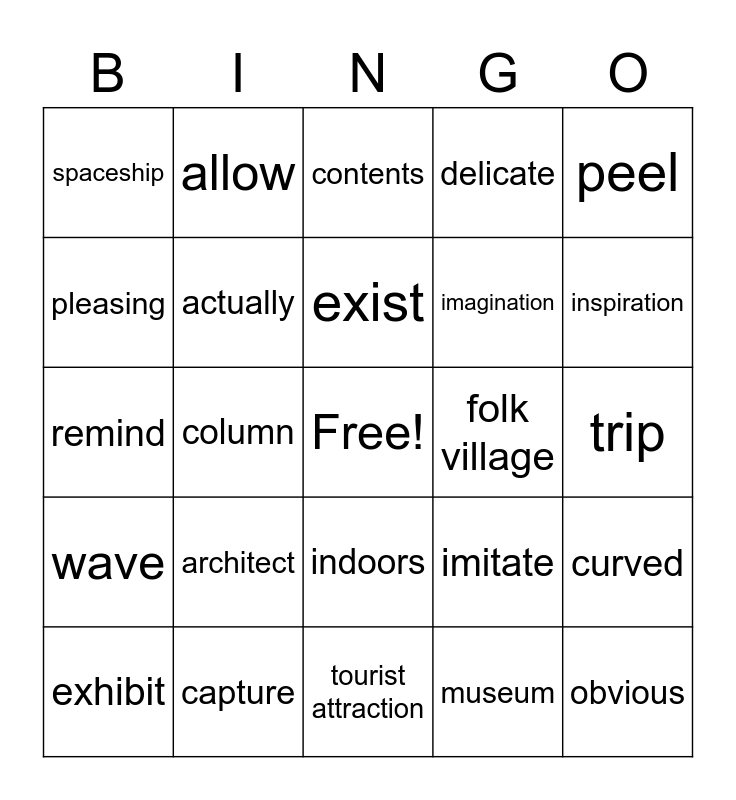 This bingo card has a free space and 24 words: architect, capture, exist, exhibit, peel, spaceship, pleasing, allow, folk village, indoors, imagination, remind, imitate, curved, actually, museum, trip, contents, inspiration, column, obvious, wave, delicate and tourist attraction.