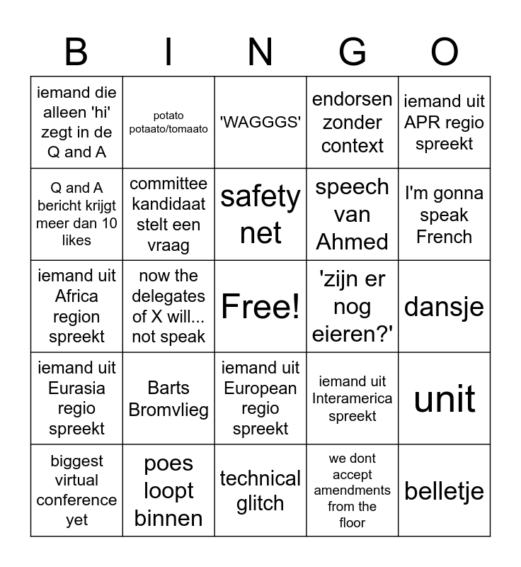This bingo card has a free space and 29 words: biggest virtual conference yet, aantal deelnemers noemen, now the delegates of X will... not speak, nationale vlag op de achtergrond, iemand die alleen 'hi' zegt in de Q and A, 'WAGGGS', committee kandidaat stelt een vraag, Barts Bromvlieg, 'zijn er nog eieren?', poes loopt binnen, dansje, belletje, technical glitch, we dont accept amendments from the floor, I'm gonna speak French, 'Does anyone know what they're saying?, iemand uit European regio spreekt, iemand uit Eurasia regio spreekt, iemand uit APR regio spreekt, iemand uit Africa region spreekt, iemand uit Interamerica spreekt, speech van Greg, speech van Ahmed, Q and A bericht krijgt meer dan 10 likes, endorsen zonder context, potato potaato/tomaato, unit, safety net and flipping the narrative.