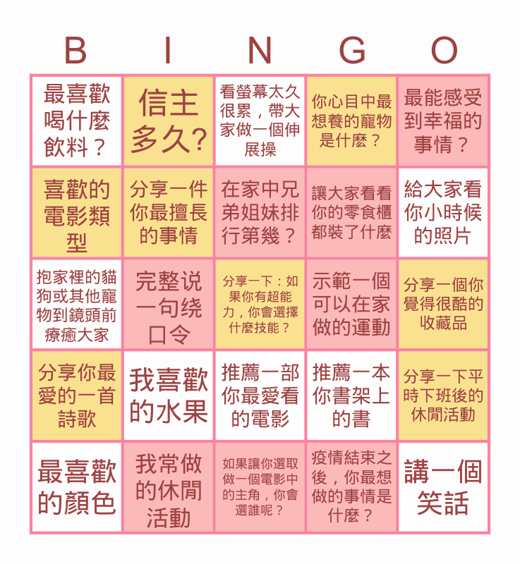 This bingo card has a free space and 24 words: 我喜歡的水果, 我常做的休閒活動, 在家中兄弟姐妹排行第幾?, 最喜歡的顏色, 最能感受到幸福的事情?, 最喜歡喝什麼飲料?, 喜歡的電影類型, 信主多久?, 示範一個可以在家做的運動, 推薦一部你最愛看的電影, 讓大家看看你的零食櫃都裝了什麼, 抱家裡的貓狗或其他寵物到鏡頭前療癒大家, 推薦一本你書架上的書, 分享一下平時下班後的休閒活動, 分享一件你最擅長的事情, 疫情結束之後,你最想做的事情是什麼?, 分享一個你覺得很酷的收藏品, 看螢幕太久很累,帶大家做一個伸展操, 給大家看你小時候的照片, 完整说一句绕口令, 講一個笑話, 分享你最愛的一首詩歌, 你心目中最想養的寵物是什麽? and 如果讓你選取做一個電影中的主角,你會選誰呢?.
