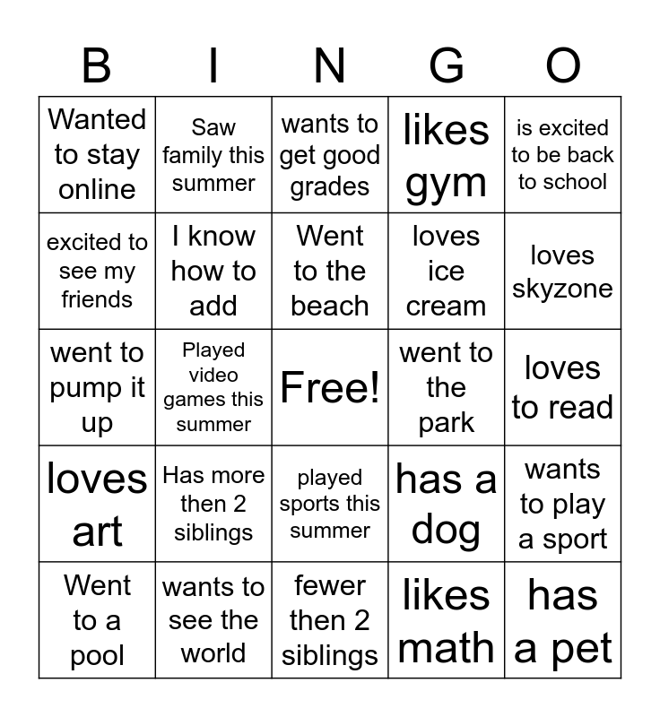 This bingo card has a free space and 25 words: Has more then 2 siblings, fewer then 2 siblings, Went to the beach, Went to a pool, is excited to be back to school, Wanted to stay online, excited to see my friends, Saw family this summer, went to the park, played sports this summer, loves ice cream, went to pump it up, has a dog, wants to play a sport, I know how to add, has a cat, loves to read, wants to get good grades, loves skyzone, Played video games this summer, has a pet, wants to see the world, loves art, likes gym and likes math.