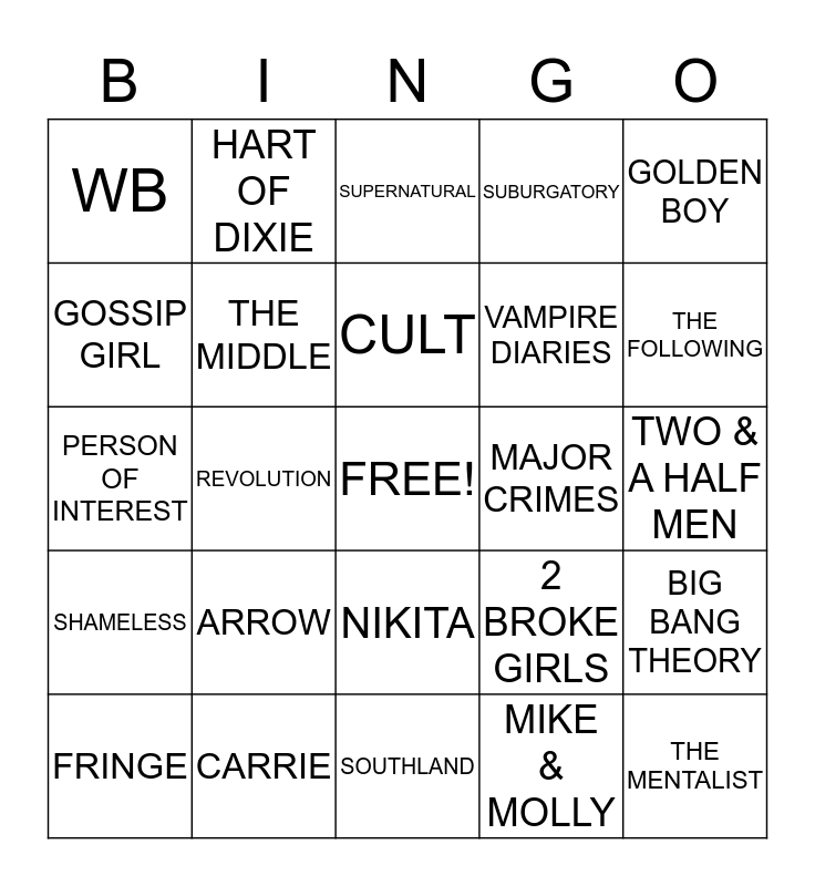 This bingo card has a free space and 24 words: ARROW, CARRIE, CULT, FRINGE, GOLDEN BOY, WB, GOSSIP GIRL, HART OF DIXIE, MAJOR CRIMES, NIKITA, VAMPIRE DIARIES, PERSON OF INTEREST, 2 BROKE GIRLS, BIG BANG THEORY, THE MIDDLE, MIKE & MOLLY, TWO & A HALF MEN, SUPERNATURAL, THE FOLLOWING, REVOLUTION, THE MENTALIST, SHAMELESS, SUBURGATORY and SOUTHLAND.