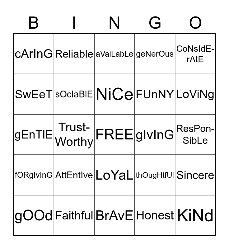 This bingo card has a free space and 24 words: AttEntIve, Faithful, NiCe, gOOd, CoNsIdE- rAtE, cArInG, SwEeT, Reliable, gIvInG, LoYaL, FUnNY, gEnTlE, thOugHtfUl, Sincere, sOcIaBlE, Honest, ResPon- SibLe, aVaiLabLe, LoViNg, Trust- Worthy, KiNd, fORgIvInG, geNerOus and BrAvE.