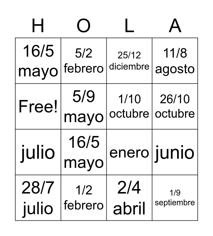 This bingo card has 16 words: 1/2 febrero, junio, 25/12 diciembre, 16/5 mayo, julio, 5/2 febrero, enero, 2/4 abril, Free!, 5/9 mayo, 28/7 julio, 11/8 agosto, 16/5 mayo, 26/10 octubre, 1/10 octubre and 1/9 septiembre.