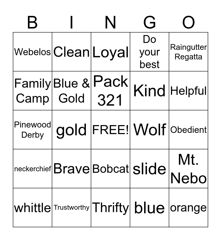 This bingo card has a free space and 35 words: 1st grade, 7 YearsOld, Bear, Blue & Gold, Bobcat, Do your best, Family Camp, Flag ceremony, Pack 321, Pack meetings, Pinewood Derby, Raingutter Regatta, Avonworth, Tiger, Webelos, Wolf, blue, gold, neckerchief, orange, slide, whittle, Mt. Nebo, Trustworthy, Loyal, Helpful, Friendly, Courteous, Kind, Obedient, Cheerful, Thrifty, Brave, Clean and Reverent.