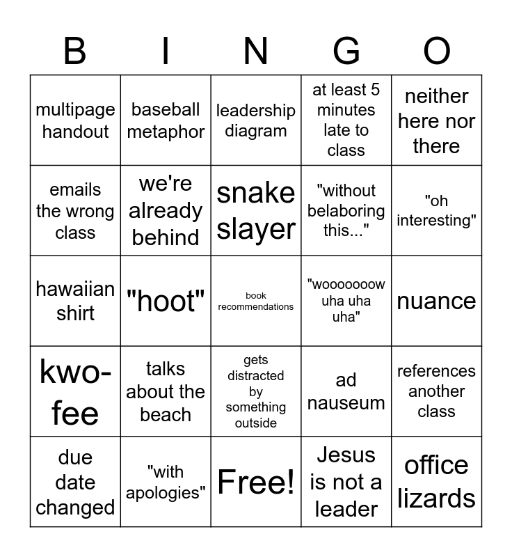 This bingo card has 25 words: kwo-fee, "with apologies", book recommendations, Jesus is not a leader, neither here nor there, multipage handout, baseball metaphor, leadership diagram, "wooooooow uha uha uha", references another class, emails the wrong class, we're already behind, Free!, ad nauseum, "oh interesting", due date changed, "hoot", snake slayer, "without belaboring this...", nuance, hawaiian shirt, talks about the beach, gets distracted by something outside, at least 5 minutes late to class and office lizards.