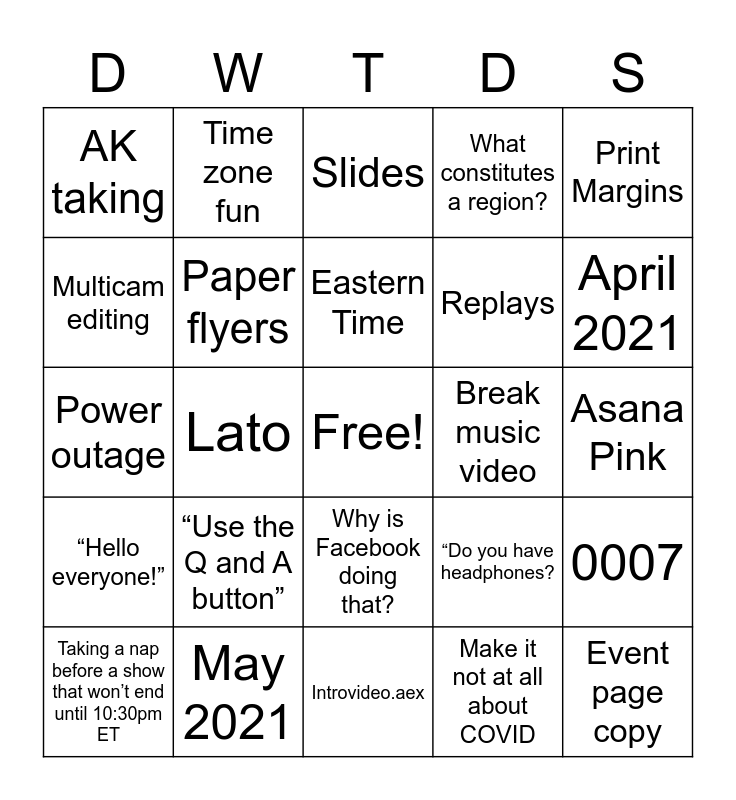 This bingo card has a free space and 33 words: Doctor musical chairs, Mount Sinai, Lato, Host language, “Hello everyone!”, Paper flyers, Print Margins, Taking a nap before a show that won’t end until 10:30pm ET, Time zone fun, Pacific Time, Eastern Time, Slides, Tech checks, Mechanism of action, Break music video, April 2021, May 2021, Power outage, “Use the Q and A button”, “Do you have headphones?, Why is Facebook doing that?, Doctor running late, AK taking, Asana Pink, Introvideo.aex, Event page copy, What constitutes a region?, Replays, Multicam editing, 0007, Make it all about COVID, Make it not at all about COVID and UAMS.