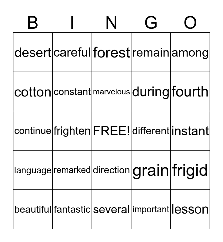 This bingo card has a free space and 24 words: remarked, fantastic, marvelous, beautiful, among, desert, cotton, careful, different, direction, during, continue, grain, frigid, constant, important, instant, forest, fourth, frighten, lesson, language, remain and several.