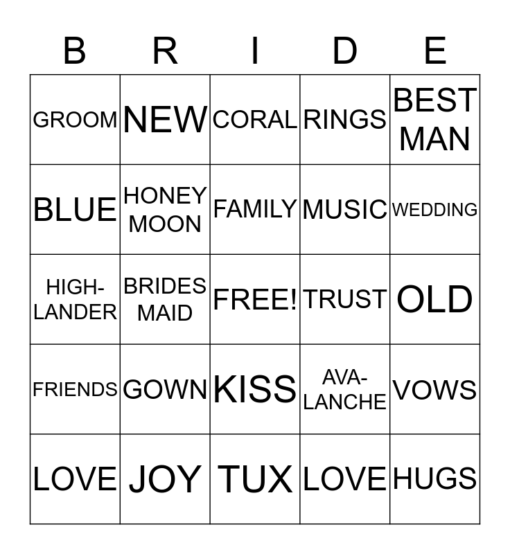 This bingo card has a free space and 24 words: GOWN, JOY, FAMILY, LOVE, BEST MAN, GROOM, BLUE, NEW, TRUST, KISS, MUSIC, HIGH- LANDER, AVA- LANCHE, VOWS, HONEY MOON, LOVE, OLD, CORAL, WEDDING, BRIDES MAID, HUGS, FRIENDS, RINGS and TUX.