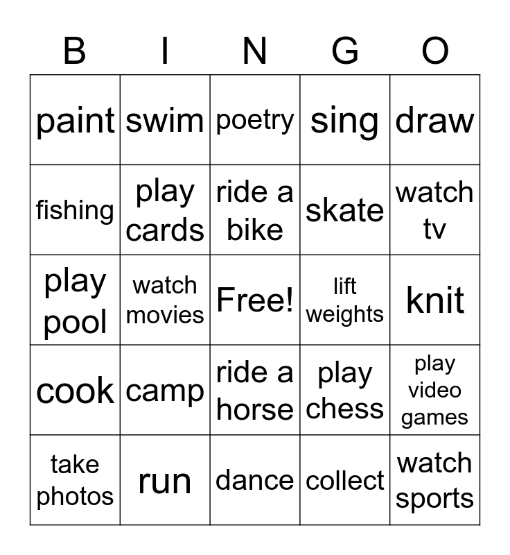 This bingo card has a free space and 24 words: camp, run, ride a bike, take photos, draw, paint, fishing, swim, lift weights, ride a horse, skate, play pool, play chess, play video games, play cards, collect, knit, poetry, watch tv, watch movies, watch sports, cook, sing and dance.
