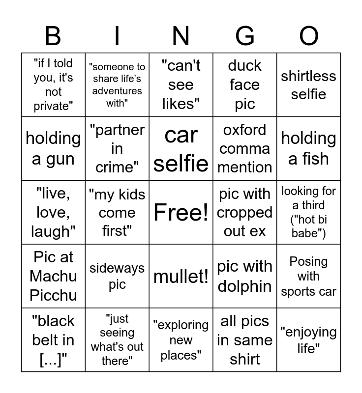 This bingo card has a free space and 24 words: sideways pic, "just seeing what's out there", car selfie, "black belt in [...]", shirtless selfie, "if I told you, it's not private", holding a gun, "someone to share life’s adventures with", pic with cropped out ex, mullet!, oxford comma mention, "live, love, laugh", pic with dolphin, Posing with sports car, "partner in crime", all pics in same shirt, looking for a third ("hot bi babe"), "can't see likes", holding a fish, "my kids come first", "enjoying life", Pic at Machu Picchu, duck face pic and "exploring new places".