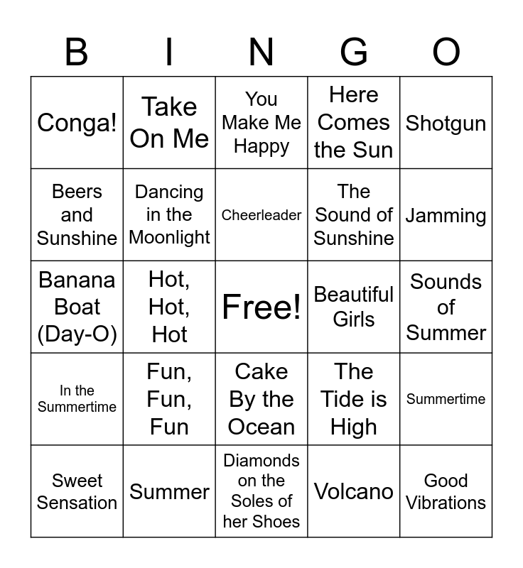 This bingo card has a free space and 53 words: Santeria, Good Vibrations, Brown Eyed Girl, Volcano, Fun, Fun, Fun, (Sittin’ On) the Dock of the Bay, Take On Me, Sweat (A La La La La La Long), Beers and Sunshine, Savage Love, Dancing in the Moonlight, Summer Girls, Summertime, The Tide is High, Wonderful World, Beautiful People, Sweet Sensation, Cheerleader, Beautiful Girls, Good Feeling, Shotgun, Hot, Hot, Hot, Send Me On My Way, The Sound of Sunshine, Conga!, Down Under, Summer, Knocking at Your Door, Lift Me Up, Say Hey (I Love You), Jamming, Riptide, Cheeseburger in Paradise, Hotel California, Angel, Bad Boys, Upside Down, Here Comes the Sun, Diamonds on the Soles of her Shoes, You Make Me Happy, Africa, I Like It Like That, Cruel Summer, Sounds of Summer, It’s 5 o’clock Somewhere, Wipe Out, Cake By the Ocean, Castaway, Hawaii Five-O, Banana Boat (Day-O), In the Summertime, Red Red Wine, I Can See Clearly Now and Three Little Birds.