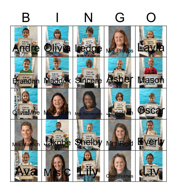 This bingo card has 25 images and 25 words: Jakobe, Lily, Sincere, Ava, Layla, Andre, Brandon, Olivia, Johnathan, Shelby, Asher, OliviaMae, Mrs.Reid, Everly, Maddox, Liv, Oscar, Ledge, Mason, Ms.Paxton, Mrs.Stevenson, Mrs.C, Mrs.Malloch, Mrs.Phillips and CoachHolmes.