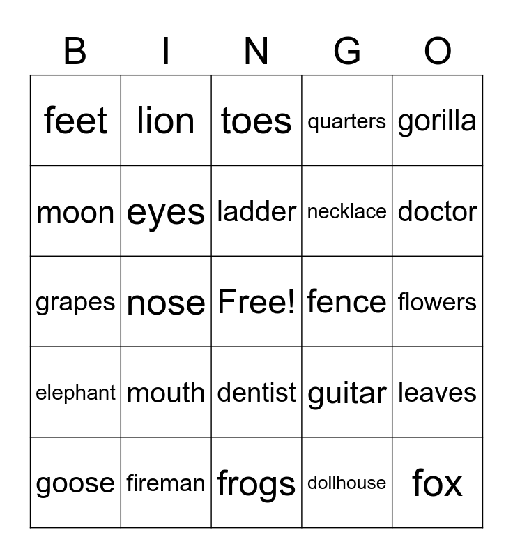 This bingo card has a free space and 29 words: goose, money, nose, hair, feet, toes, eyes, mouth, fence, fireman, flowers, fox, frogs, dollhouse, doctor, dishes, dentist, elephant, gorilla, grapes, guitar, helicopter, necklace, moon, quarters, lion, leaves, ladder and birdbath.