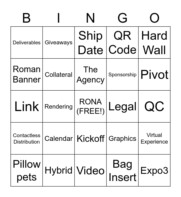 This bingo card has a free space and 24 words: Pillow pets, Calendar, The Agency, Bag Insert, Hard Wall, Deliverables, Giveaways, Ship Date, Legal, QC, Link, Collateral, Graphics, Virtual Experience, Roman Banner, Hybrid, Video, QR Code, Pivot, Contactless Distribution, Rendering, Kickoff, Sponsorship and Expo3.