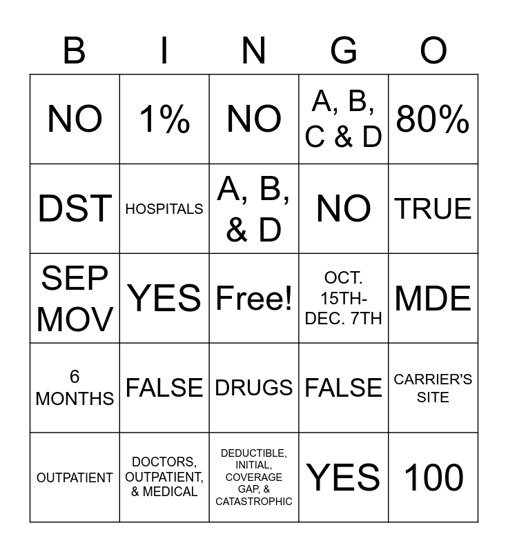 This bingo card has a free space and 40 words: DSNP, SEP MOV, 7MONTHS, HOSPITALS, DOCTORS, OUTPATIENT, & MEDICAL, DRUGS, A, B, & D, 6 MONTHS OR LESS, 80%, 6 MONTHS, YES, A, B, C & D, 100, MDE, OCT. 15TH- DEC. 7TH, FALSE, PPO, NO, YES, NO, CARRIER'S SITE, YES, NO, DST, YES, 63, FALSE, YES, FALSE, TRUE, FALSE, OUTPATIENT, 24 MONTHS, FALSE, TRUE, DEDUCTIBLE, INITIAL, COVERAGE GAP, & CATASTROPHIC, HMO-POS, WILL, 1% and $203.