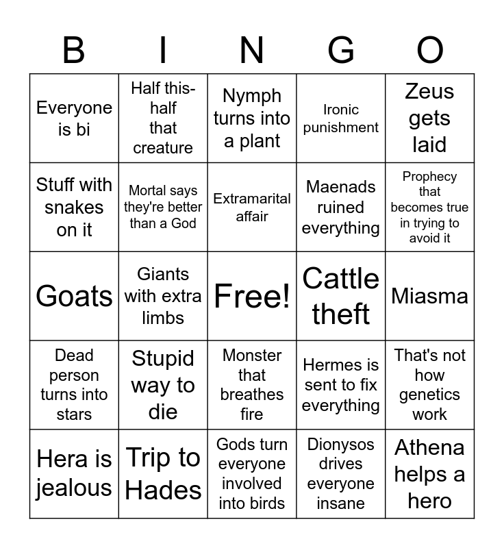 This bingo card has a free space and 24 words: Stupid way to die, Trip to Hades, Extramarital affair, Hera is jealous, Zeus gets laid, Everyone is bi, Stuff with snakes on it, Half this-half that creature, Cattle theft, Monster that breathes fire, Maenads ruined everything, Goats, Hermes is sent to fix everything, That's not how genetics work, Mortal says they're better than a God, Dionysos drives everyone insane, Miasma, Nymph turns into a plant, Prophecy that becomes true in trying to avoid it, Giants with extra limbs, Athena helps a hero, Dead person turns into stars, Ironic punishment and Gods turn everyone involved into birds.