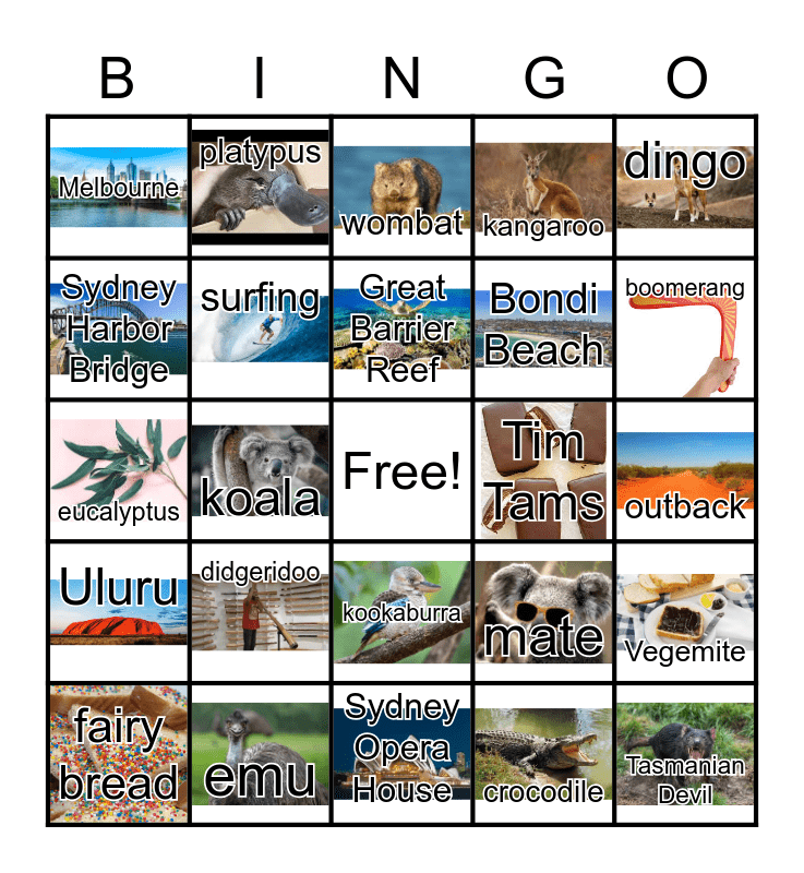 This bingo card has 24 images, a free space and 24 words: didgeridoo, emu, Great Barrier Reef, fairy bread, dingo, Melbourne, Sydney Harbor Bridge, platypus, Tim Tams, kookaburra, Bondi Beach, eucalyptus, mate, Vegemite, surfing, crocodile, outback, wombat, boomerang, koala, Tasmanian Devil, Uluru, kangaroo and Sydney Opera House.