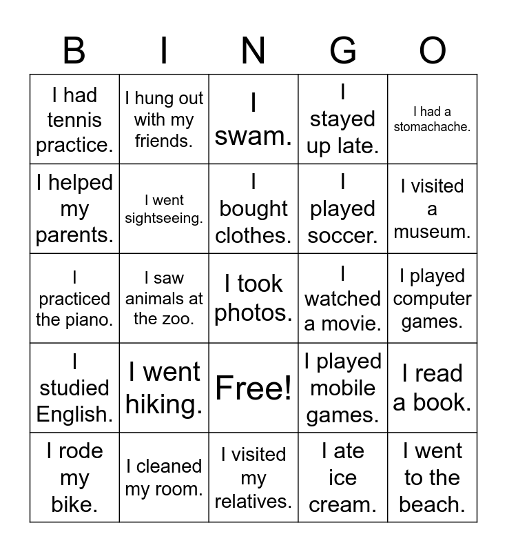 This bingo card has 26 words: Free!, I ate ice cream., I bought clothes., I cleaned my room., I had a stomachache., I had tennis practice., I helped my parents., I hung out with my friends., I played computer games., I played mobile games., I played soccer., I practiced the piano., I read a book., I rode my bike., I saw animals at the zoo., I slept in., I stayed up late., I studied English., I swam., I took photos., I visited a museum., I visited my relatives., I watched a movie., I went hiking., I went sightseeing. and I went to the beach..