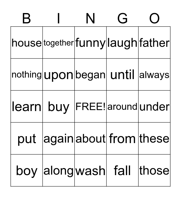 This bingo card has a free space and 24 words: again, along, began, boy, father, house, nothing, together, around, about, until, learn, from, these, upon, fall, under, funny, always, buy, those, put, laugh and wash.