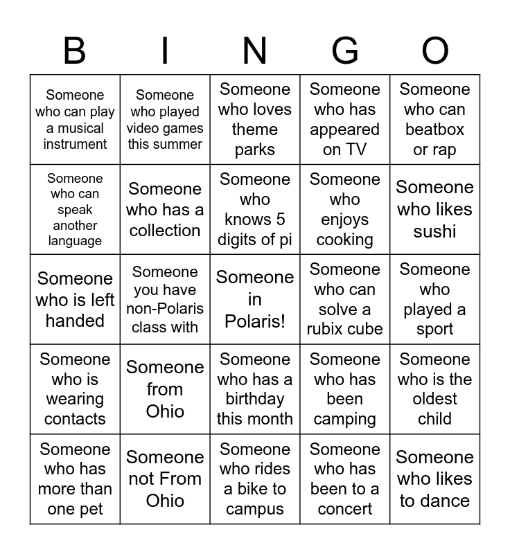 This bingo card has a free space and 24 words: Someone from Ohio, Someone not From Ohio, Someone who knows 5 digits of pi, Someone who has more than one pet, Someone who can beatbox or rap, Someone who can play a musical instrument, Someone who can speak another language, Someone who played video games this summer, Someone who can solve a rubix cube, Someone who has a birthday this month, Someone who enjoys cooking, Someone who is left handed, Someone who has been camping, Someone who is the oldest child, Someone who has a collection, Someone who has been to a concert, Someone who played a sport, Someone who loves theme parks, Someone who likes sushi, Someone you have non-Polaris class with, Someone who likes to dance, Someone who is wearing contacts, Someone who has appeared on TV and Someone who rides a bike to campus.