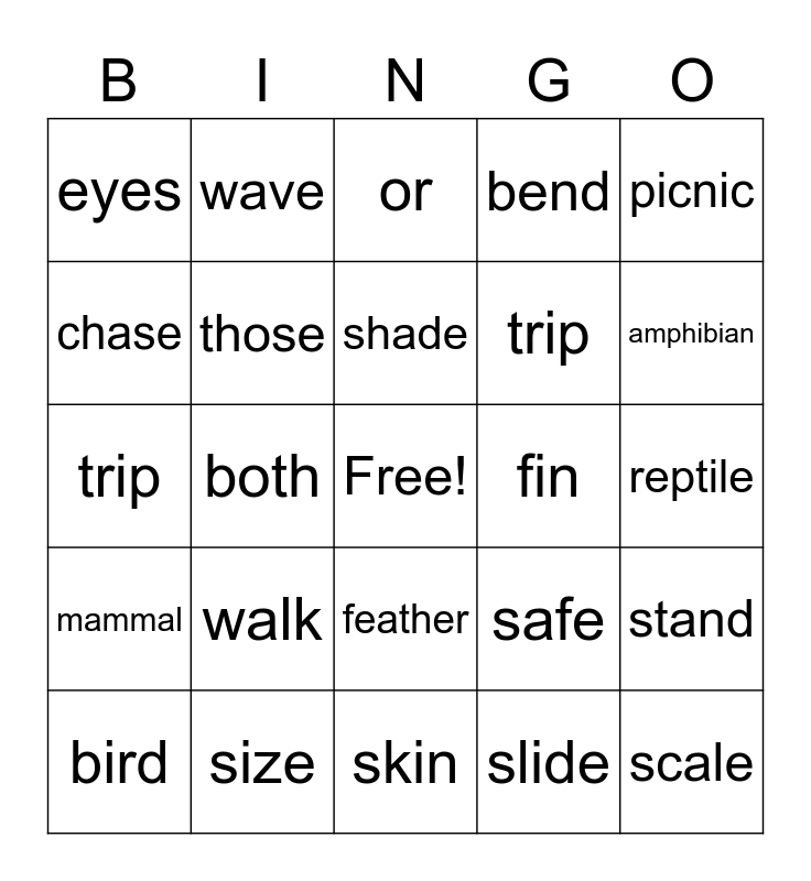 This bingo card has a free space and 29 words: bird, fly, both, long, eyes, or, those, walk, fin, size, reptile, scale, skin, slide, amphibian, bill, feather, mammal, picnic, trip, safe, obey, trip, chase, bend, wave, stand, shade and race.