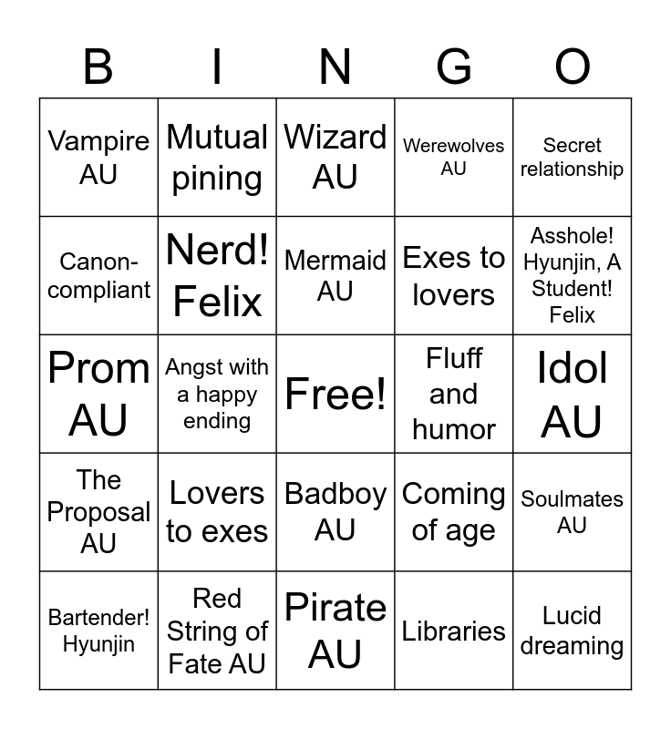 This bingo card has a free space and 90 words: Apocalypse AU, Arranged marriage AU, Badboy AU, Beauty and the Beast AU, Coffee Shop AU, College /University AU, Cruel intentions AU, Detective AU, Fairytale AU, Flower Shop AU, Hanahaki Disease AU, Harry Potter AU, Highschool AU, Idol AU, Medical AU, Mermaid AU, Modern Royalty AU, My girlfriend is a gumiho AU, Mystery/Crime AU, Office Workers AU, Omegaverse (SFW), Paranormal AU, Pirate AU, Post breakup AU, Prom AU, Red String of Fate AU, Rival bands AU, Rockstars AU, Roommates AU, Royalty AU, Single parent AU, Soulmates AU, Sports AU, The Proposal AU, Vampire AU, Werewolves AU, Wizard AU, 5+1, Angst with a happy ending, Asshole! Hyunjin, A Student! Felix, Bartender! Hyunjin, Canon-compliant, Canon-divergence, Catboy! Felix, Childhood best friends to lovers, Coming of age, Coworkers, Crack, Enemies to lovers, Established relationship, Exes fake pretend, Exes to lovers, Fake/pretend Relationship, Feelings denial, Feelings realization, Flower meanings, Fluff and humor, Friends to lovers, Gay awakening, Getting back, Happy ending, Heavy angst, Holidays, Hurt/comfort, Idiots in love, Jealous ex, Jealousy, Libraries, Long haired tattoo! Hyunjin, Long-distance relationship, Lovers to exes, Lucid dreaming, Meet cute, Meet ugly, Mutual pining, Nerd! Felix, Non-angst exes to lovers, One-sided pining, Painter! Hyunjin, Rivalry, Sci-fi, Secret relationship, Sexual tension, Sharing a bed, Sharing clothes, Slow burn, Stealing kisses, Strangers to lovers, Unrequited love and Weddings.