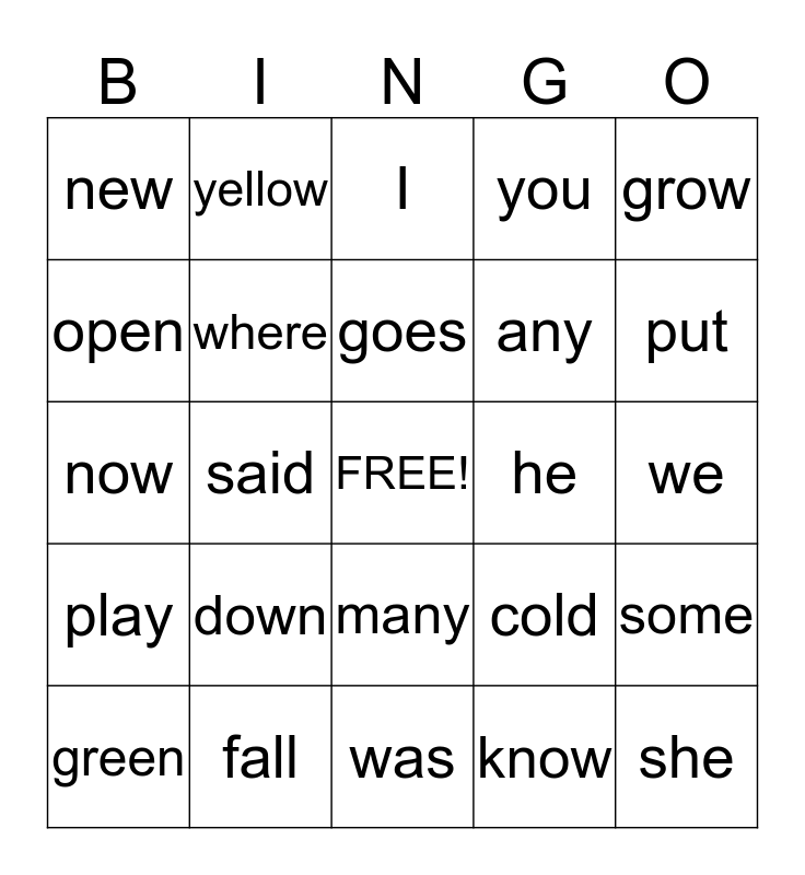 This bingo card has a free space and 24 words: down, fall, goes, green, grow, new, open, yellow, he, many, any, now, cold, some, where, know, we, I, put, said, she, play, you and was.