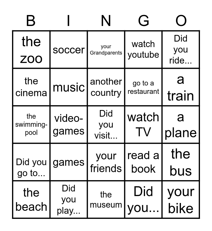 This bingo card has 25 words: Did you go to..., Did you play..., Did you visit..., Did you..., Did you ride..., the zoo, soccer, your Grandparents, watch TV, the bus, the cinema, music, the museum, read a book, a train, the beach, video-games, another country, go to a restaurant, a plane, the swimming-pool, games, your friends, watch youtube and your bike.