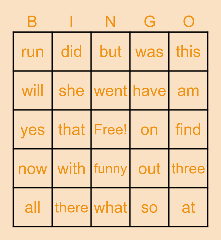 This bingo card has a free space and 25 words: with, what, went, all, this, run, will, did, on, funny, have, yes, out, three, she, get, find, but, am, that, at, there, now, was and so.