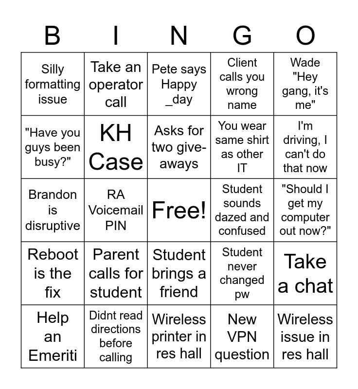 This bingo card has a free space and 29 words: Help an Emeriti, MAC Address - "I dont have a Mac", RA Voicemail PIN, IT Other than HD mentions drinking, Silly formatting issue, Pete says Happy _day, KH Case, Parent calls for student, Student sounds dazed and confused, Didnt read directions before calling, "Should I get my computer out now?", Wireless issue in res hall, Wireless printer in res hall, New VPN question, I'm driving, I can't do that now, Client curses, Student brings a friend, Reboot is the fix, Wade "Hey gang, it's me", Brandon is disruptive, Student never changed pw, Fist bump (non HD), You wear same shirt as other IT, "Have you guys been busy?", Client calls you wrong name, Take an operator call, Take a chat, Asks for two give-aways and Non-IT question, walk-in.