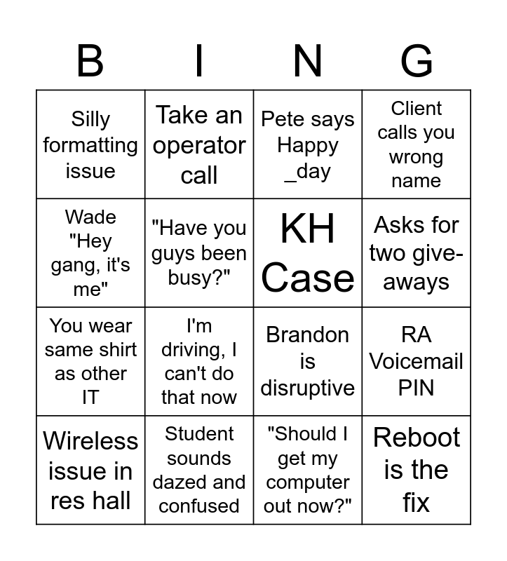 This bingo card has 29 words: Help an Emeriti, MAC Address - "I dont have a Mac", RA Voicemail PIN, IT Other than HD mentions drinking, Silly formatting issue, Pete says Happy _day, KH Case, Parent calls for student, Student sounds dazed and confused, Didnt read directions before calling, "Should I get my computer out now?", Wireless issue in res hall, Wireless printer in res hall, New VPN question, I'm driving, I can't do that now, Client curses, Student brings a friend, Reboot is the fix, Wade "Hey gang, it's me", Brandon is disruptive, Student never changed pw, Fist bump (non HD), You wear same shirt as other IT, "Have you guys been busy?", Client calls you wrong name, Take an operator call, Take a chat, Asks for two give-aways and Non-IT question, walk-in.
