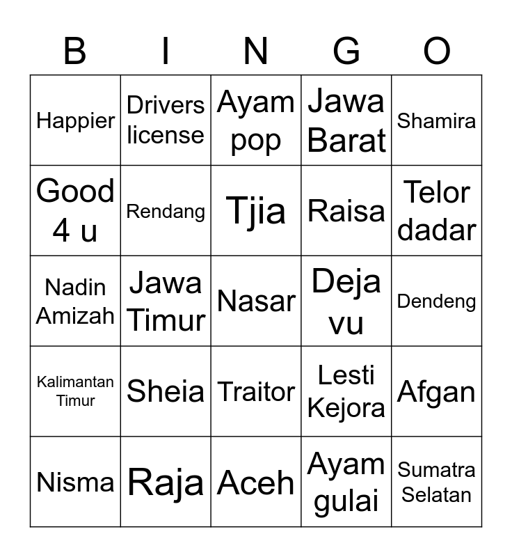 This bingo card has a free space and 24 words: Sheia, Raja, Tjia, Nisma, Shamira, Happier, Good 4 u, Drivers license, Deja vu, Traitor, Raisa, Nadin Amizah, Lesti Kejora, Afgan, Rendang, Ayam gulai, Dendeng, Ayam pop, Telor dadar, Jawa Timur, Sumatra Selatan, Kalimantan Timur, Jawa Barat and Aceh.