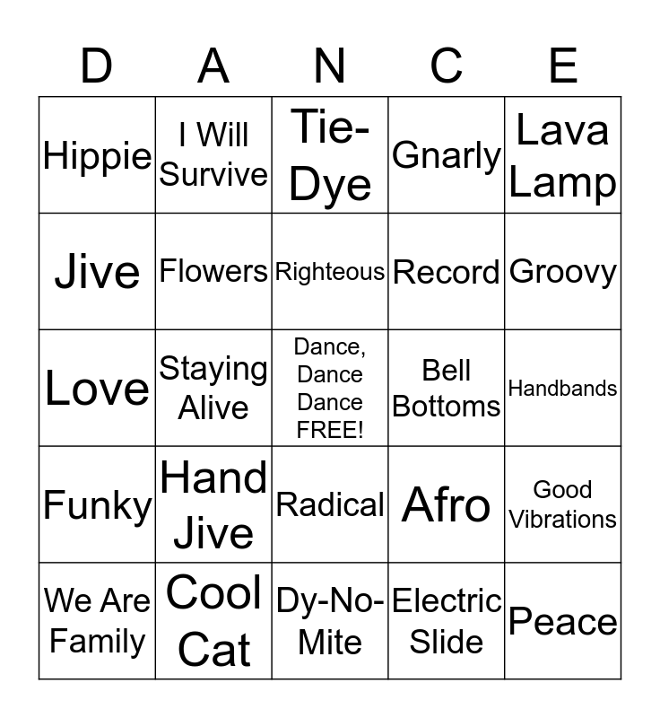 This bingo card has a free space and 24 words: Hand Jive, Cool Cat, Righteous, We Are Family, Lava Lamp, Hippie, Jive, I Will Survive, Bell Bottoms, Radical, Record, Love, Afro, Good Vibrations, Flowers, Electric Slide, Handbands, Tie-Dye, Groovy, Staying Alive, Peace, Funky, Gnarly and Dy-No-Mite.