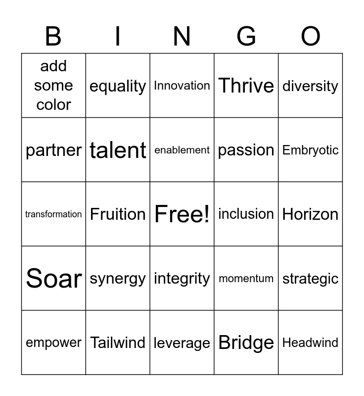 This bingo card has a free space and 25 words: synergy, leverage, enablement, empower, diversity, add some color, partner, equality, inclusion, integrity, passion, transformation, momentum, strategic, talent, Pioneer, Horizon, Innovation, Embryotic, Fruition, Headwind, Tailwind, Soar, Thrive and Bridge.