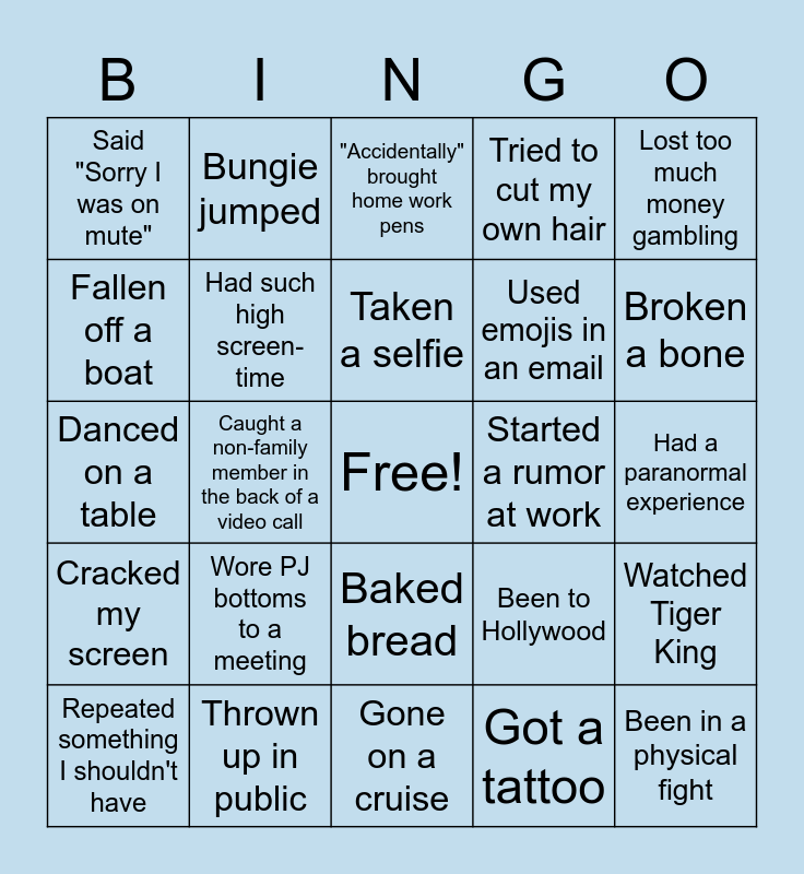 This bingo card has a free space and 24 words: Wore PJ bottoms to a meeting, Thrown up in public, Taken a selfie, Repeated something I shouldn't have, Lost too much money gambling, Said "Sorry I was on mute", Fallen off a boat, Bungie jumped, Started a rumor at work, Baked bread, Used emojis in an email, Danced on a table, Been to Hollywood, Watched Tiger King, Had such high screen-time, Got a tattoo, Had a paranormal experience, "Accidentally" brought home work pens, Broken a bone, Caught a non-family member in the back of a video call, Been in a physical fight, Cracked my screen, Tried to cut my own hair and Gone on a cruise.
