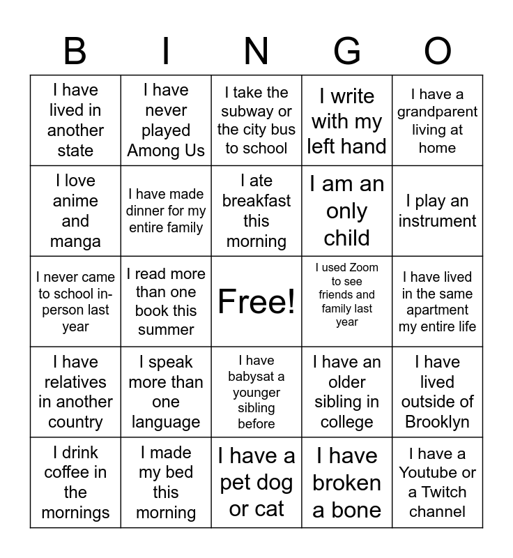 This bingo card has a free space and 24 words: I speak more than one language, I made my bed this morning, I ate breakfast this morning, I drink coffee in the mornings, I have a grandparent living at home, I have lived in another state, I love anime and manga, I have never played Among Us, I used Zoom to see friends and family last year, I have babysat a younger sibling before, I am an only child, I never came to school in-person last year, I have an older sibling in college, I have lived outside of Brooklyn, I have made dinner for my entire family, I have broken a bone, I have lived in the same apartment my entire life, I take the subway or the city bus to school, I play an instrument, I read more than one book this summer, I have a Youtube or a Twitch channel, I have relatives in another country, I write with my left hand and I have a pet dog or cat.