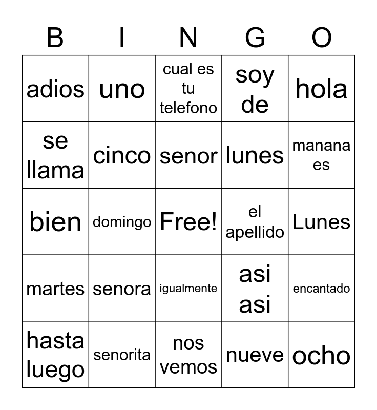 This bingo card has a free space and 24 words: senora, senorita, senor, hasta luego, hola, adios, se llama, uno, el apellido, igualmente, lunes, bien, asi asi, encantado, cinco, nueve, Lunes, cual es tu telefono, manana es, domingo, ocho, martes, soy de and nos vemos.