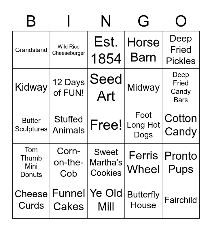 This bingo card has a free space and 31 words: Ye Old Mill, Giant Slide, Stuffed Animals, 1919 Root Beer, Grandstand, Est. 1854, 12 Days of FUN!, Ferris Wheel, Foot Long Hot Dogs, Butterfly House, Cotton Candy, Fairchild, Turkey Legs, Space Tower, Deep Fried Candy Bars, Fresh French Fries, Pronto Pups, Corn-on-the-Cob, Tom Thumb Mini Donuts, Sweet Martha’s Cookies, Deep Fried Pickles, Gizmo, Cheese Curds, Wild Rice Cheeseburger, Midway, Kidway, Horse Barn, Butter Sculptures, Funnel Cakes, Seed Art and Skyride.
