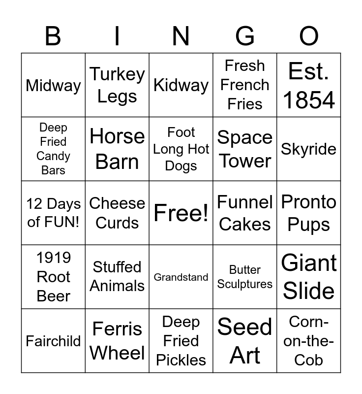 This bingo card has a free space and 31 words: Deep Fried Pickles, Gizmo, Cheese Curds, Wild Rice Cheeseburger, Midway, Kidway, Horse Barn, Butter Sculptures, Funnel Cakes, Seed Art, Pronto Pups, Corn-on-the-Cob, Tom Thumb Mini Donuts, Sweet Martha’s Cookies, Skyride, Ye Old Mill, Giant Slide, Stuffed Animals, 1919 Root Beer, Grandstand, Est. 1854, Cotton Candy, Fairchild, Turkey Legs, Space Tower, Deep Fried Candy Bars, Fresh French Fries, 12 Days of FUN!, Ferris Wheel, Foot Long Hot Dogs and Butterfly House.