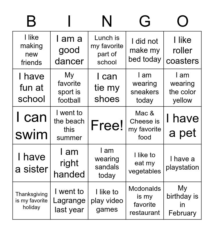 This bingo card has a free space and 24 words: I am right handed, I went to Lagrange last year, I can tie my shoes, Thanksgiving is my favorite holiday, I like roller coasters, I like making new friends, I have fun at school, I am a good dancer, Mac & Cheese is my favorite food, I am wearing sandals today, I am wearing sneakers today, I can swim, I like to eat my vegetables, I have a playstation, My favorite sport is football, Mcdonalds is my favorite restaurant, I have a pet, Lunch is my favorite part of school, I am wearing the color yellow, I went to the beach this summer, My birthday is in February, I have a sister, I did not make my bed today and I like to play video games.